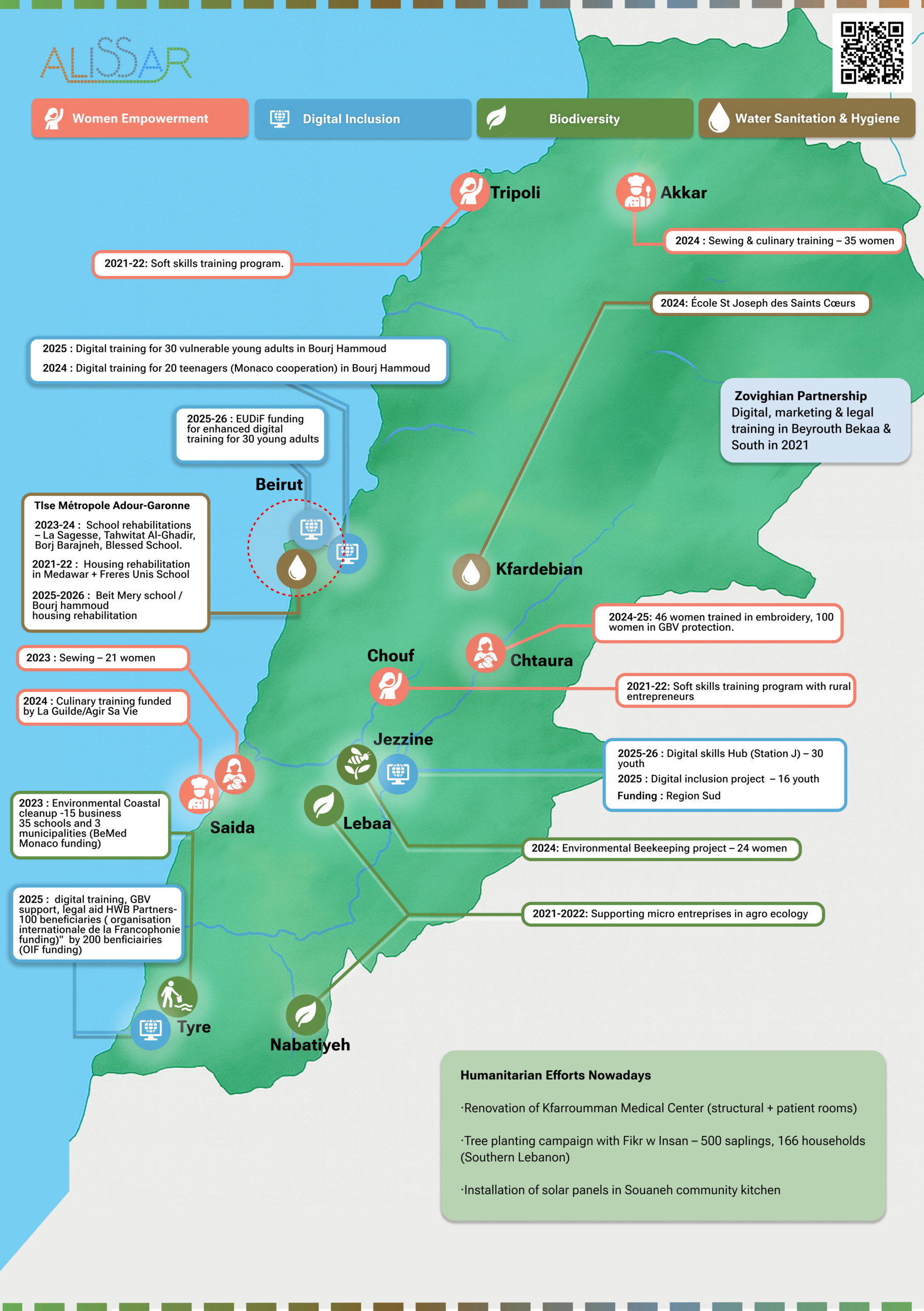 The Water and Sanitation 2022/2023 project, financed by Toulouse Métropole and water agency of Adour Garonne, is a response to the Beirut port explosion of August 4, 2020, which caused massive destruction over a radius of more than 5km. Alissar has rehabilitated the sanitation systems of an underprivileged neighborhood in Medawar and the “Frères Unis” school in Dekwaneh. Thanks to this project, drinking water of the highest quality is now available to the school’s students and staff, as well as to the residents of the Medawar neighborhood.